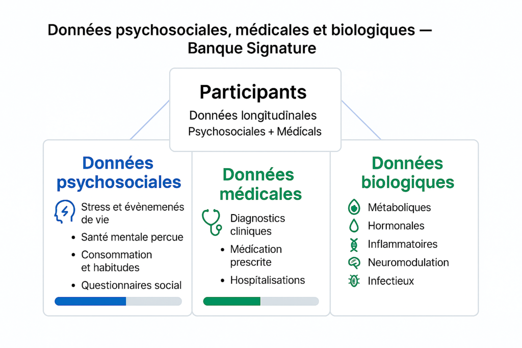 Depuis 2009 plus de 80 chercheurs et cliniciens ont participé à l’élaboration du projet et à la sélection des 23 questionnaires psycho-sociaux et une équipe d’experts internationaux ont identifié 23 biomarqueurs candidats pour constituer la Biobanque Signature.  La collecte de données débute à l’admission à l’urgence de l’hôpital et peut être suivi de 3 collectes longitudinales  selon le protocole de la Biobanque Signature et le recrutement des participant est continu.  Plusieurs projets de recherche utilisant nos données sont actuellement en cours.