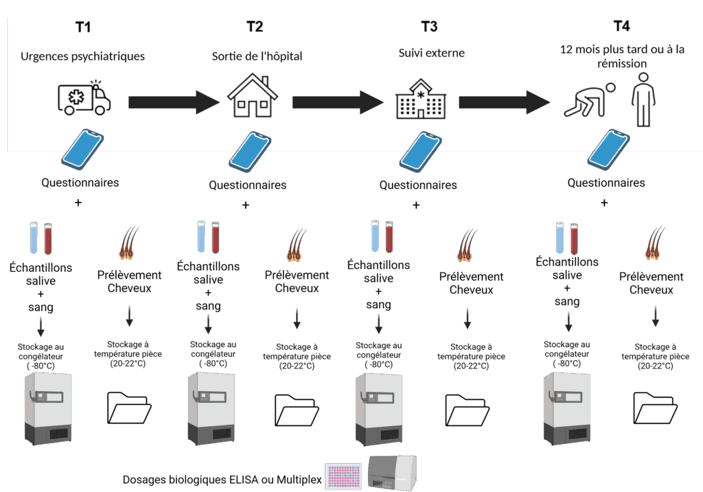Au cours du projet, des mesures bio-psychosociales sont collectées à des quatre moments critiques du cheminement du participant, pour comprendre la crise, la réponse au traitement et éventuellement le succès du rétablissement.